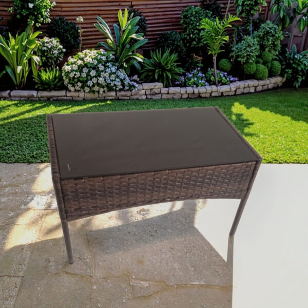 - Blat: Wykonany z hartowanego czarnego szkła, nadaje się do użytku na zewnątrz i wewnątrz.